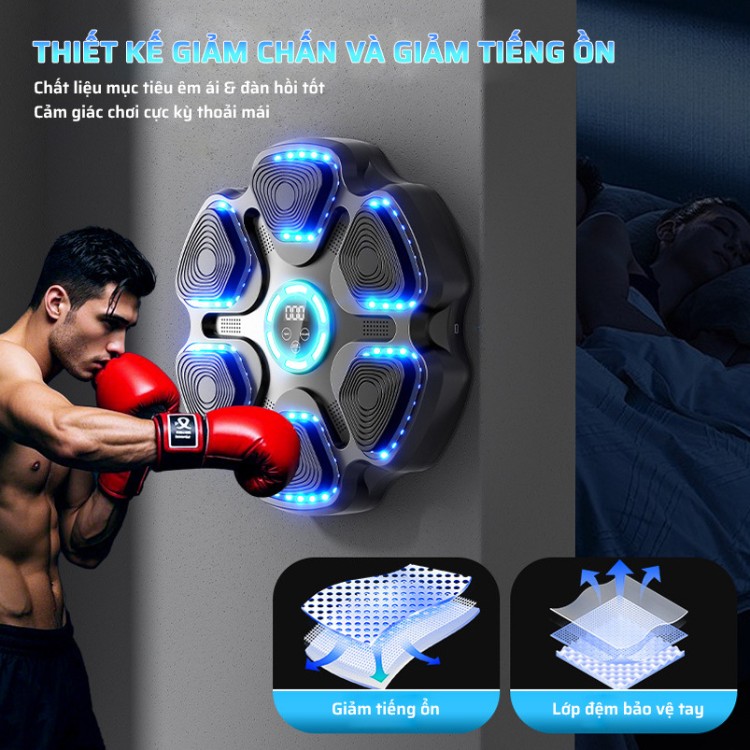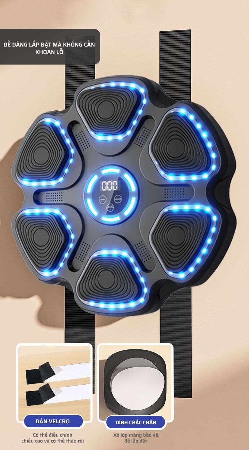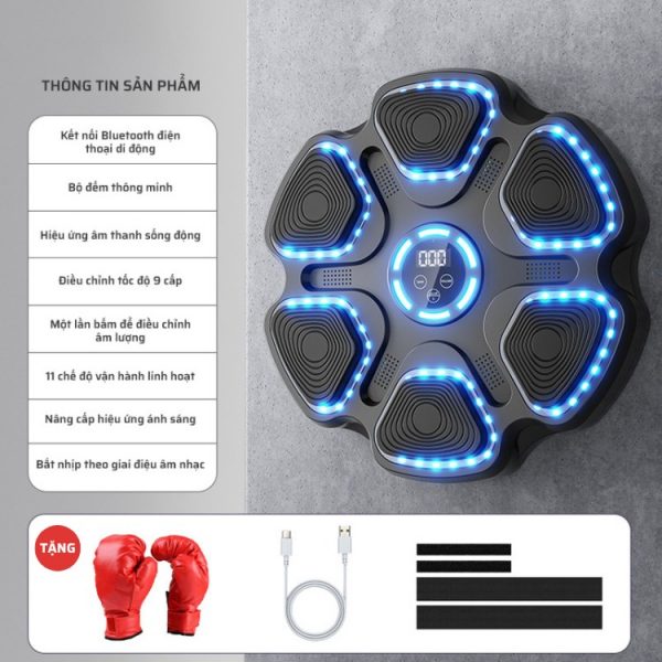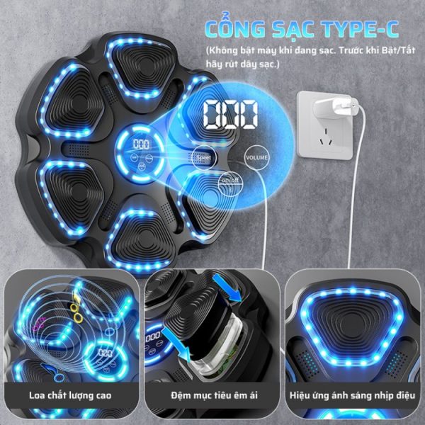 • Đèn led định vị điểm đấm: Đèn LED định vị điểm đấm xuất hiện cùng với nhạc giúp bạn tập trung vào từng cú đấm chính xác. Đây là tính năng hữu ích để cải thiện độ chính xác và tăng cường kỹ thuật boxing.
