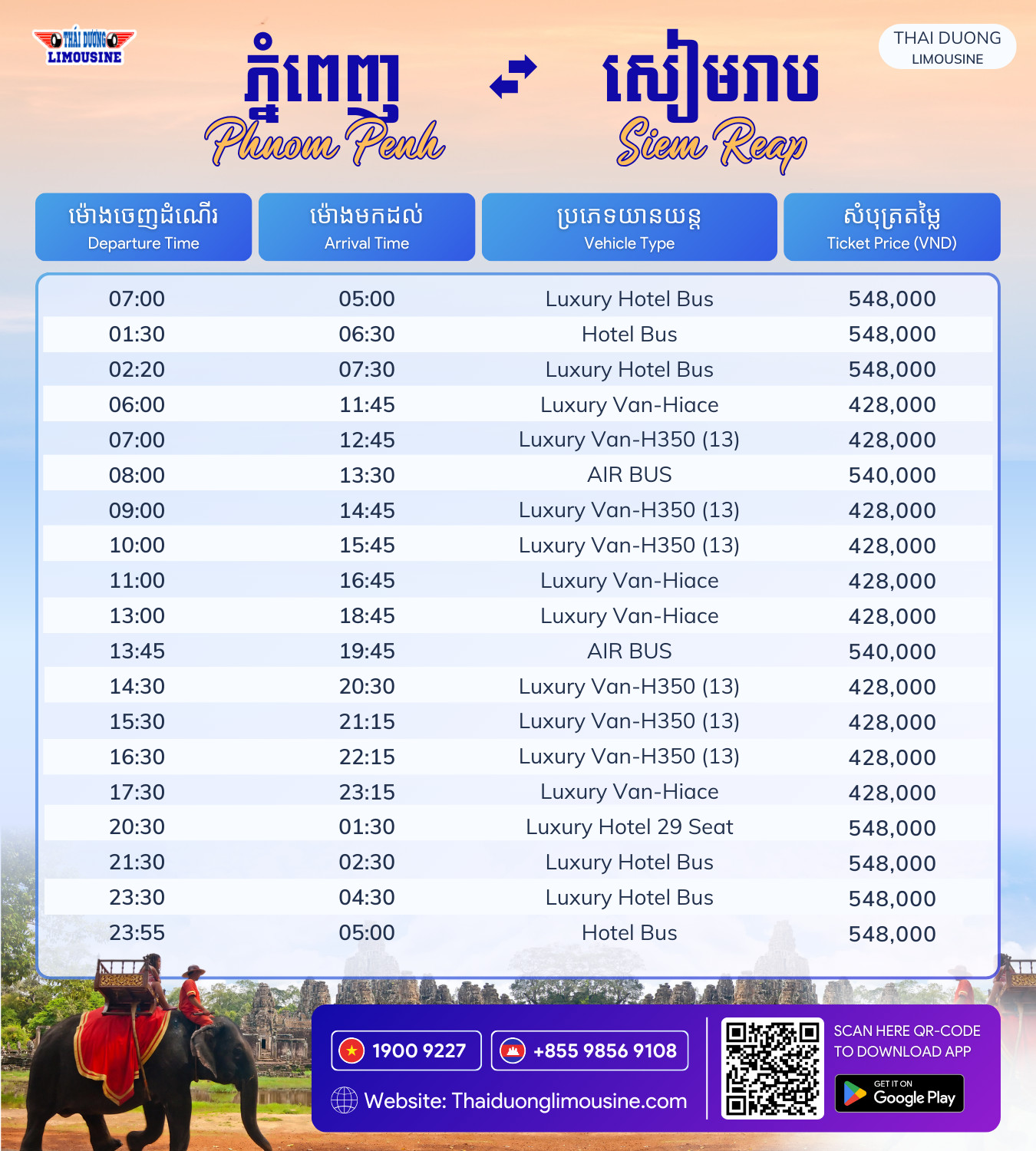 Bảng Thời Gian Xe Open Bus khởi hành từ Phnom penh:
