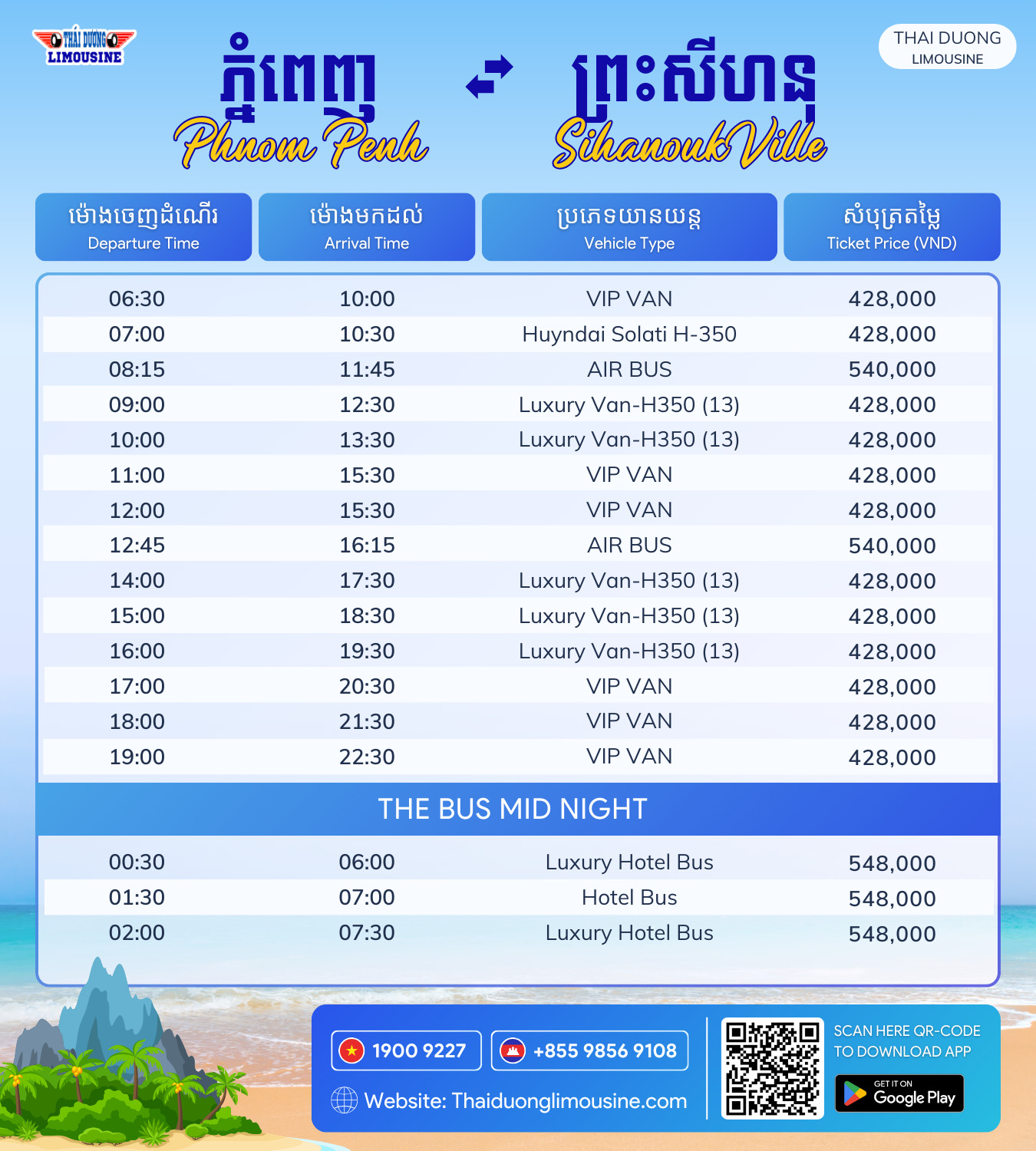 Bảng Thời Gian Xe Open Bus khởi hành từ Phnom penh: