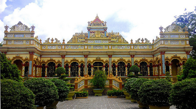 - Đến Mỹ Tho, Quý khách dừng chân tham quan chùa Vĩnh Tràng – đây là một ngôi chùa nổi tiếng ở Nam Bộ, được xếp hạng di tích lịch sử cấp quốc gia). Sau đó quý khách lên thuyền tham quan những bè nuôi cá nổitrên sông Cưủ Long bằng thuyền lớn, tìm hiểu nghề nuôi cá của dân địa phương. Thuyền đi ngang qua cầu Rạch Miễu (là một cây cầu dây văng nối liền 2 tỉnh Tiền Giang và Bến Tre với nhau).